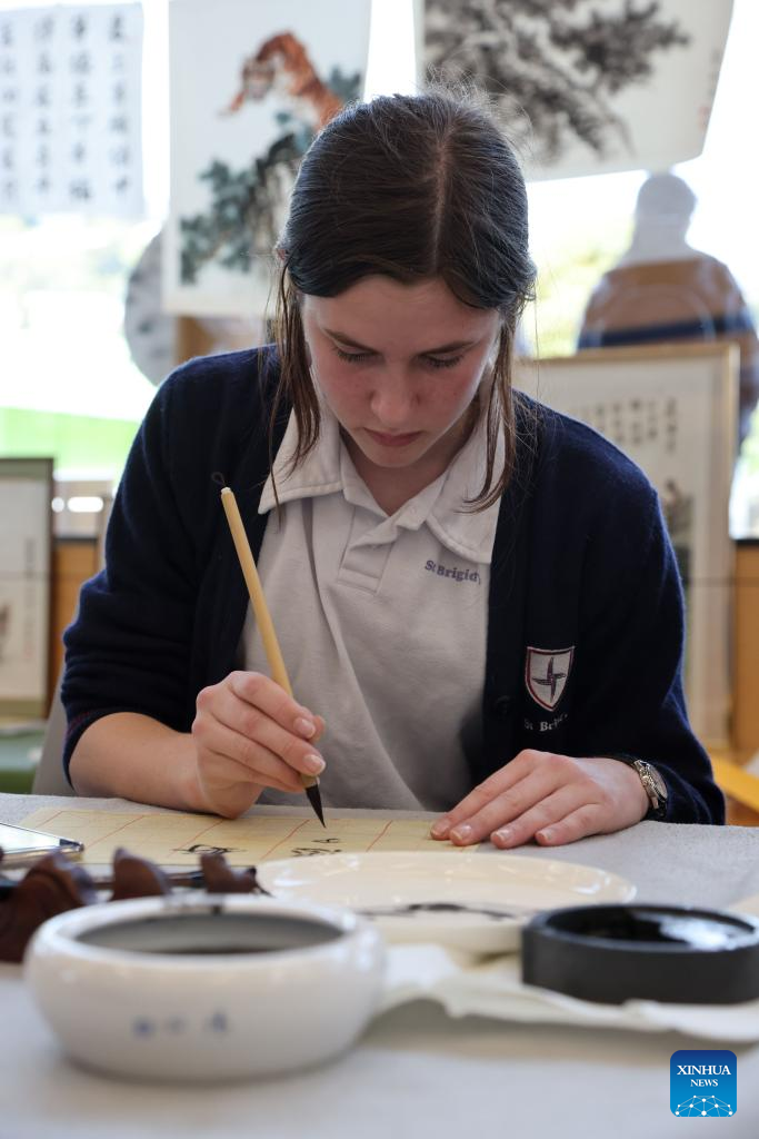 A student practices Chinese calligraphy at a community library in Wellington, New Zealand, Sept. 27, 2022. The opening reception of New Zealand Chinese Language Week 2022 was held on Monday evening at the Grand Hall of Parliament Buildings in Wellington. During this week, New Zealand will host a series of traditional Chinese cultural activities. (Photo by Meng Tao/Xinhua)