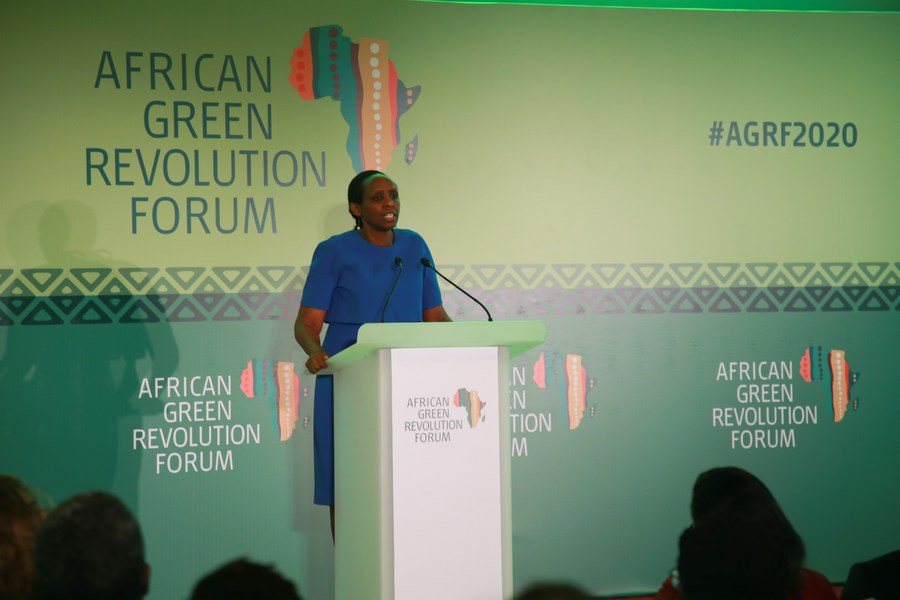 Agnes Kalibata, president of Alliance for a Green Revolution in Africa (AGRA), delivers remarks at an event to launch the African Green Revolution Forum (AGRF) 2020 Summit in Kigali, capital city of Rwanda, Nov. 26, 2019. (Xinhua/Lyu Tianran)