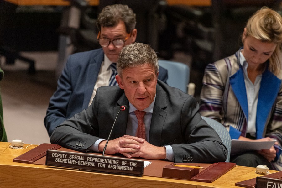 Markus Potzel (Front), the UN secretary-general's deputy special representative for Afghanistan, speaks at a Security Council meeting at the UN headquarters in New York, on Sept. 27, 2022. (Rick Bajornas/UN Photo/Handout via Xinhua)