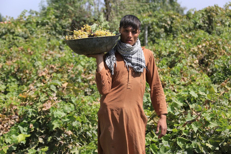 An Afghan farmer harvests grapes in Parwan province, Afghanistan, Sept. 11, 2022. (Photo by Saifurahman Safi/Xinhua)
