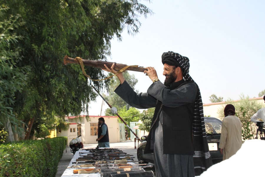 A man checks a weapon seized by Afghan law enforcement agencies in Jalalabad, capital city of Nangarhar province, Afghanistan, Sept. 21, 2022. (Photo by Aimal Zahir/Xinhua)