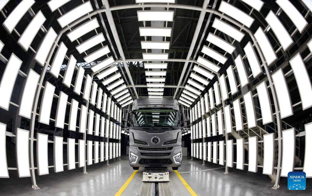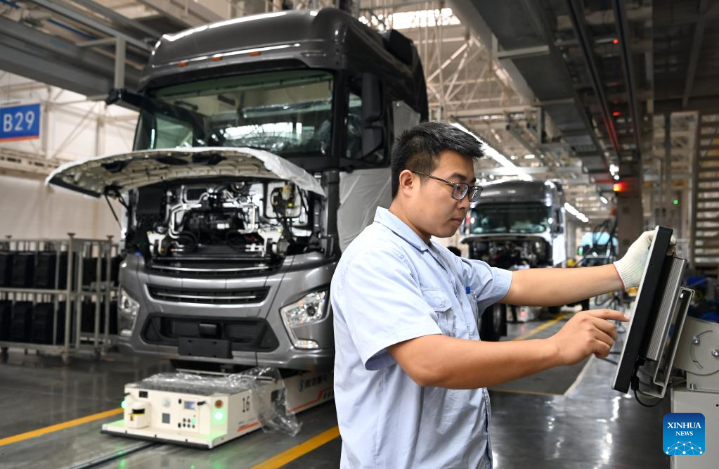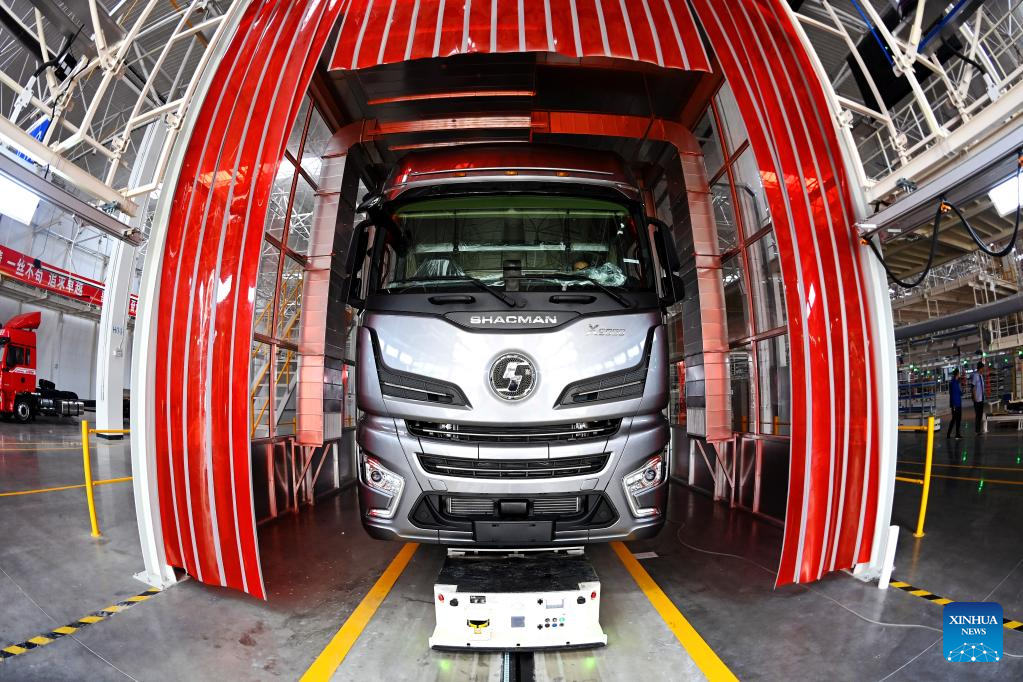 A heavy truck undergoes a test on the assembly line of the heavy truck capacity expansion project at the Shaanxi Automobile Holding Group in Xi'an, northwest China's Shaanxi Province, Sept. 27, 2022. Shaanxi Automobile Holding Group is a leading enterprise in equipment manufacturing in Shaanxi Province.