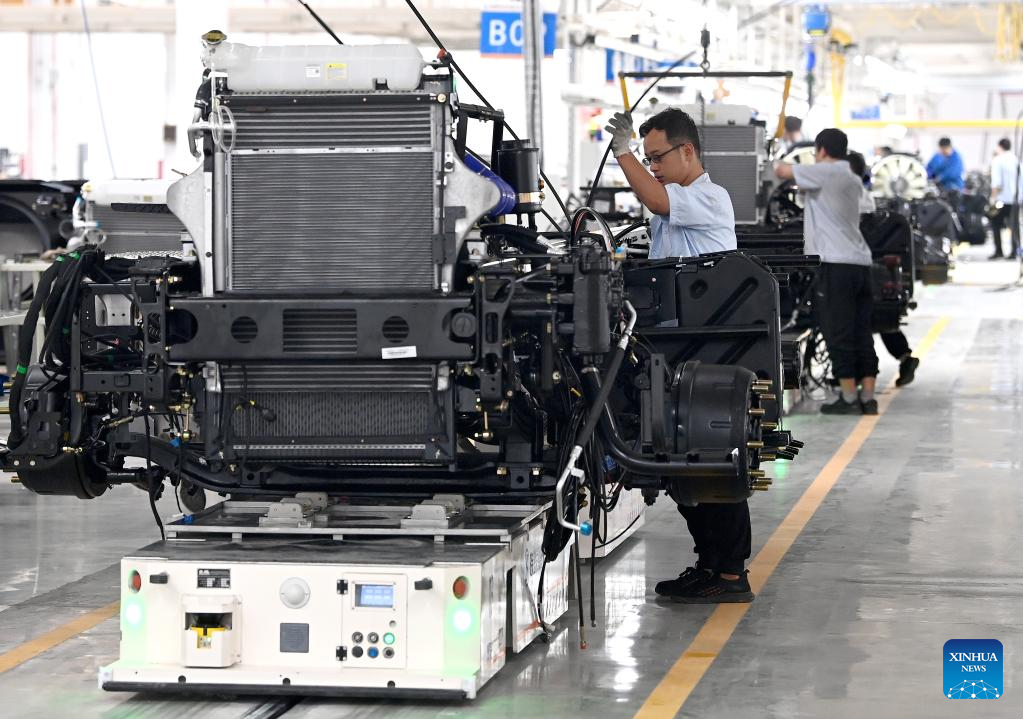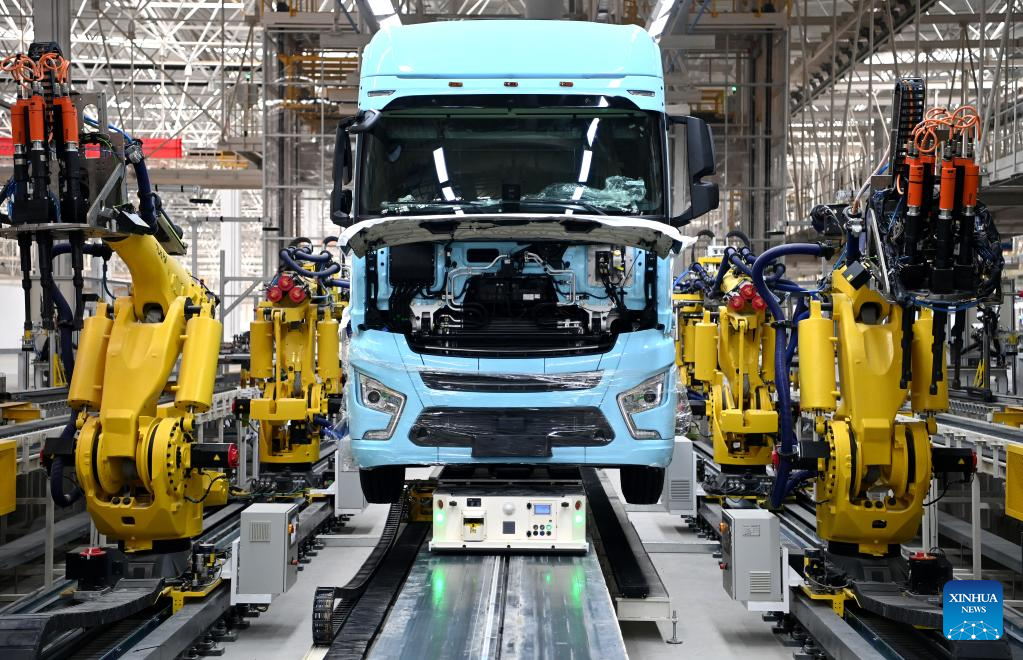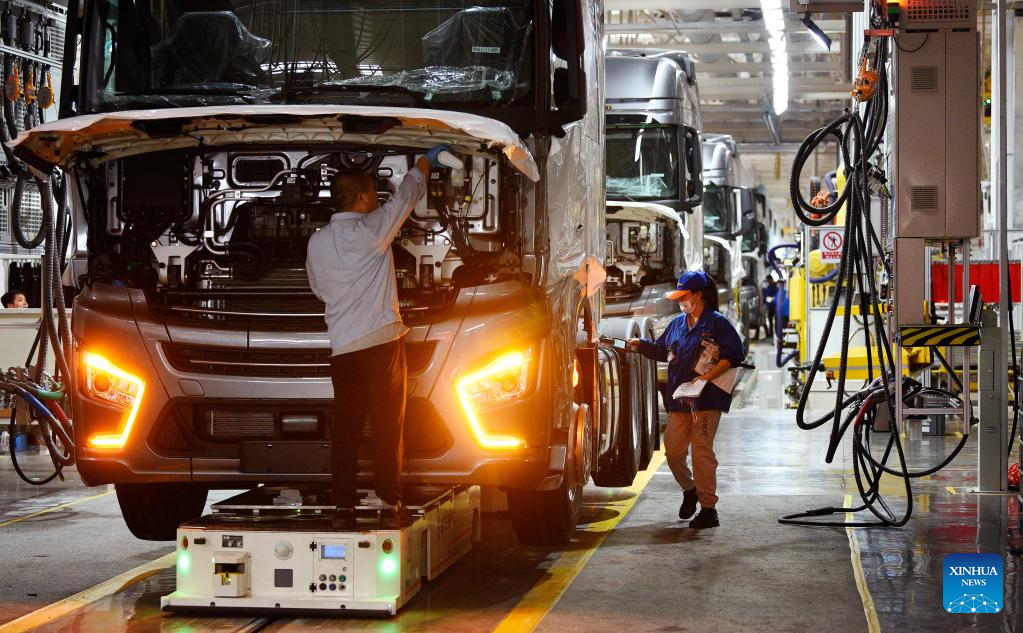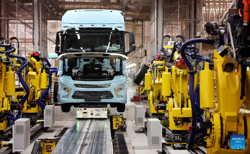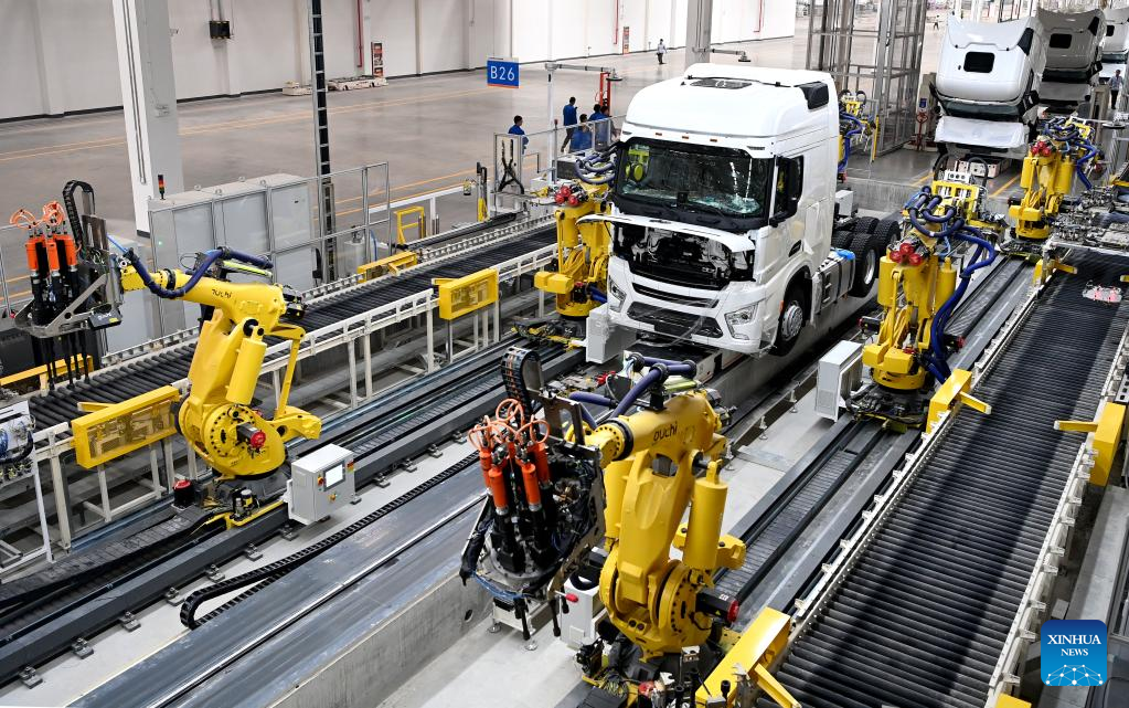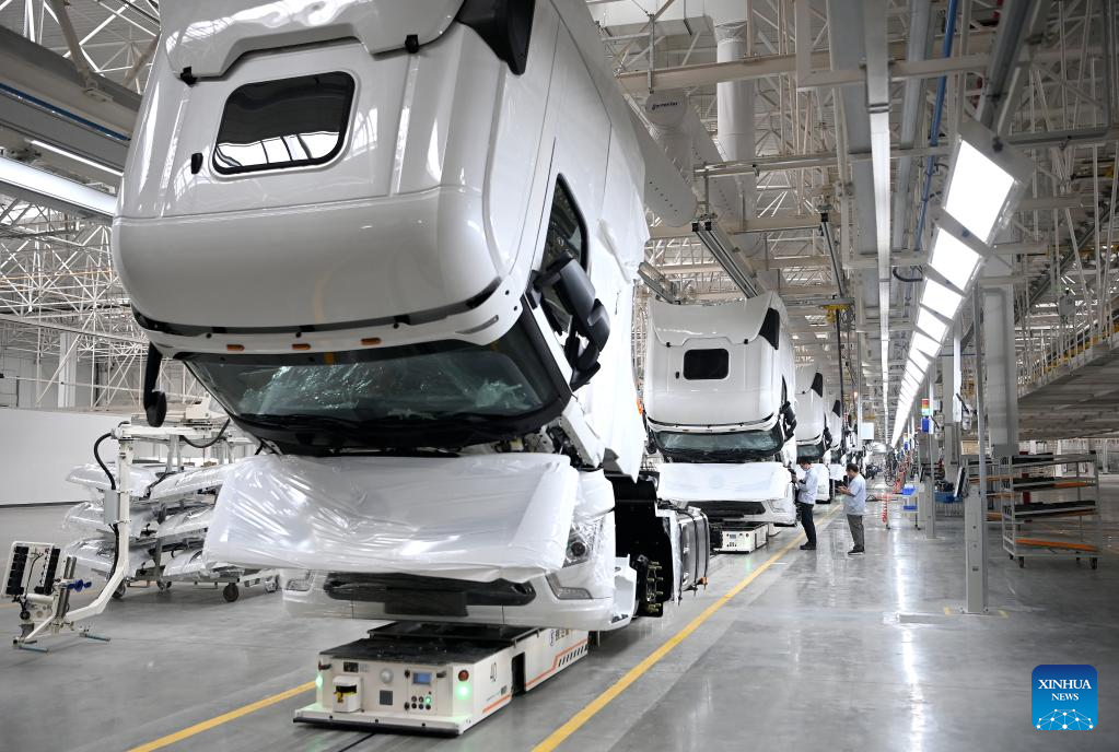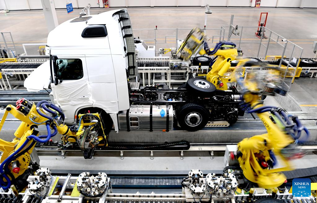 A heavy truck is assembled on the assembly line of the heavy truck capacity expansion project at the Shaanxi Automobile Holding Group in Xi'an, northwest China's Shaanxi Province, Sept. 27, 2022. Shaanxi Automobile Holding Group is a leading enterprise in equipment manufacturing in Shaanxi Province.
