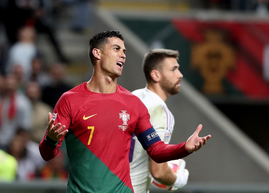 Cristiano Ronaldo (L) of Portugal reacts during the League A Group 2 match against Spain at the 2022 UEFA Nations League in Lisbon, Sept. 27, 2022. (Photo by Pedro Fiuza/Xinhua)