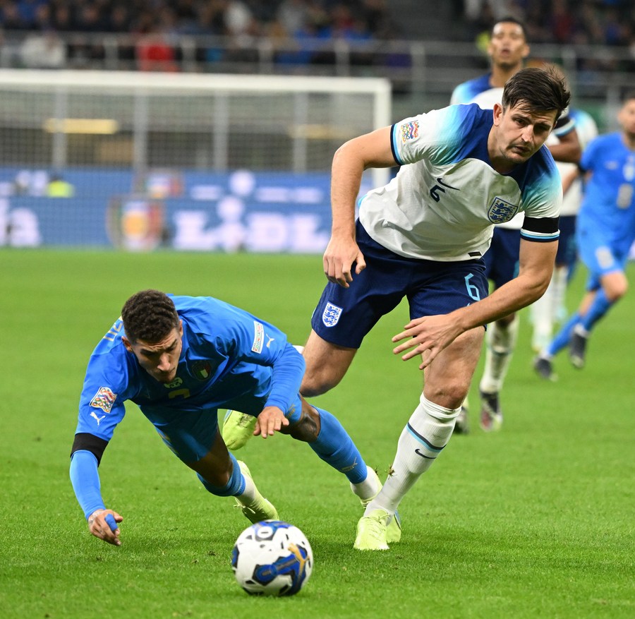 Italy's Giovanni Di Lorenzo (L) vies with England's Harry Maguire during the League A Group 3 match at the 2022 UEFA Nations League in Milan, Italy, Sept. 23, 2022. (Photo by Federico Tardito/Xinhua)