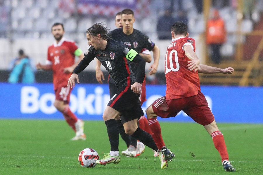 Luka Modric (front L) of Croatia vies for the ball during the FIFA World Cup Qatar 2022 Qualifying Group H football match against Russia at Stadium Poljud on Nov. 14, 2021 in Split, Croatia. (Sanjin Strukic/Pixsell via Xinhua)