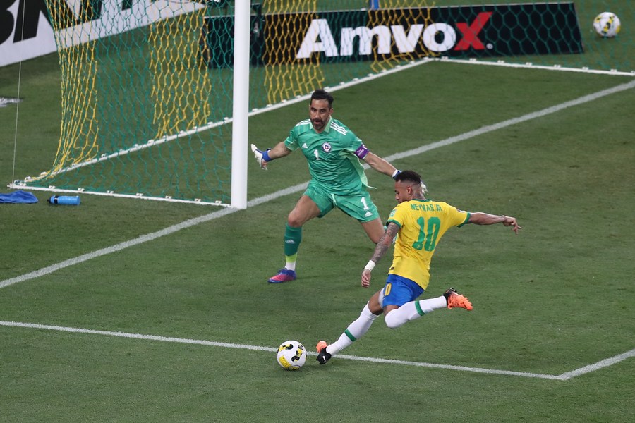 Neymar Jr (R) of Brazil shoots during the 2022 FIFA World Cup Qualifier against Chile in Rio de Janeiro on March 24, 2022. (Xinhua/Wang Tiancong)