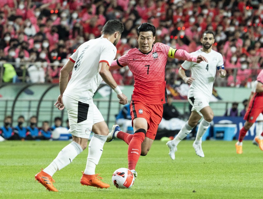 Son Heung-min (2nd L) of South Korea breaks through during a friendly match against Egypt in Seoul, June 14, 2022. (Photo by James Lee/Xinhua)