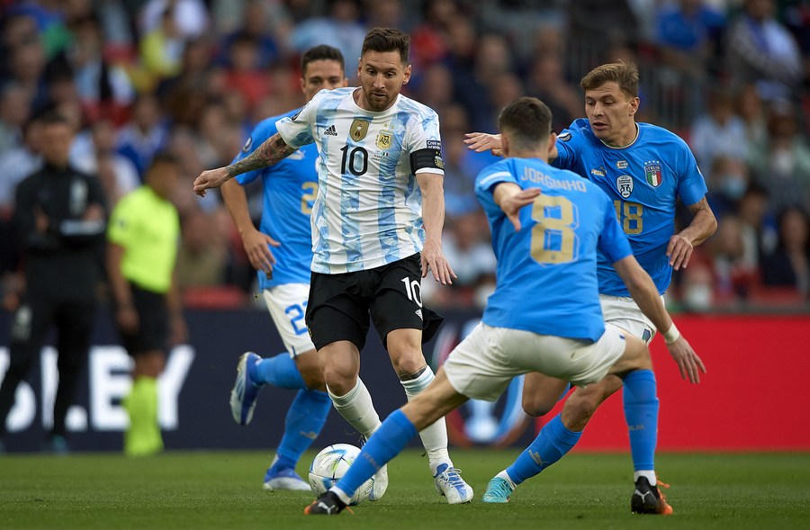 Lionel Messi (2nd L) of Argentina vies with Jorginho (2nd R) of Italy during the Finalissima 2022 match in London, June 1, 2022. (Photo by Pablo Morano/Xinhua)