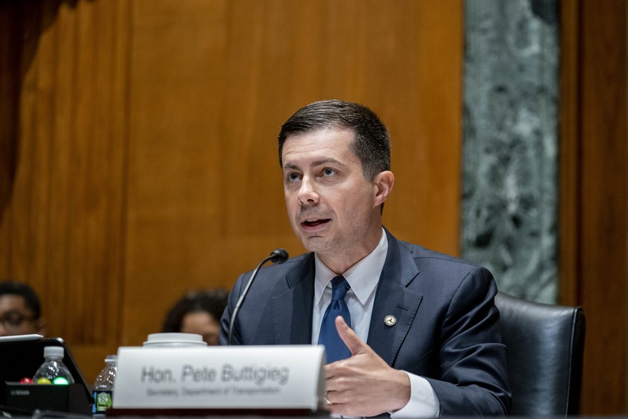 U.S. Secretary of Transportation Pete Buttigieg attends a hearing of a U.S. Senate Subcommittee on Transportation, Housing and Urban Development, and Related Agencies on Capitol Hill in Washington, D.C., the United States, on April 28, 2022. (Xinhua/Liu Jie)