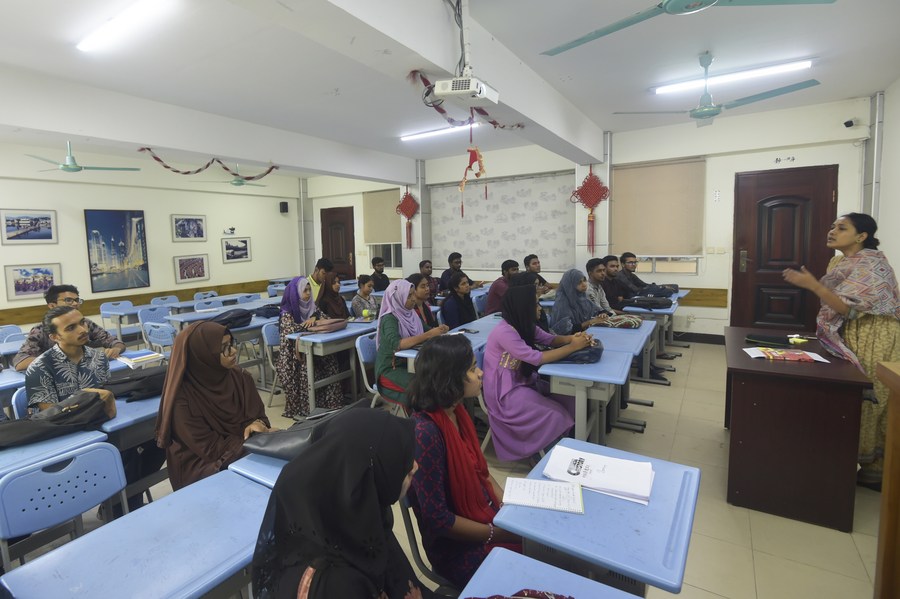 A teacher teaches Chinese language at the Dhaka University in Dhaka, Bangladesh, Aug. 17, 2022. (Xinhua)