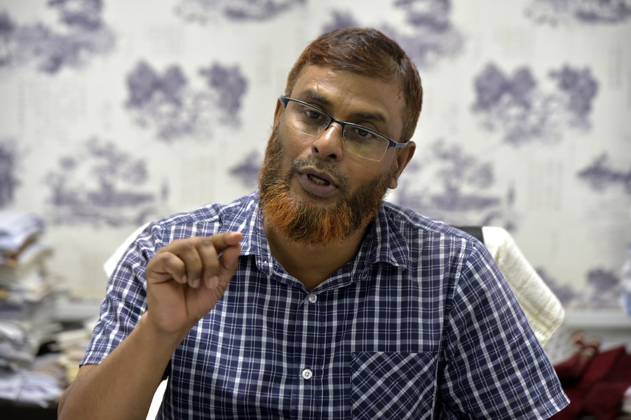 Md Afzal Hossain, the head of the Chinese Department at Dhaka University, speaks during an interview with Xinhua at his office in Dhaka, Bangladesh, Aug. 17, 2022. (Xinhua)