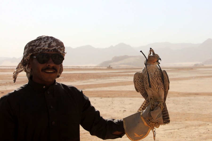 A man with his hawk is pictured during a camel race in the Wadi Rum desert, south of Jordan, on Sept. 30, 2022. (Photo by Mohammad Abu Ghosh/Xinhua)