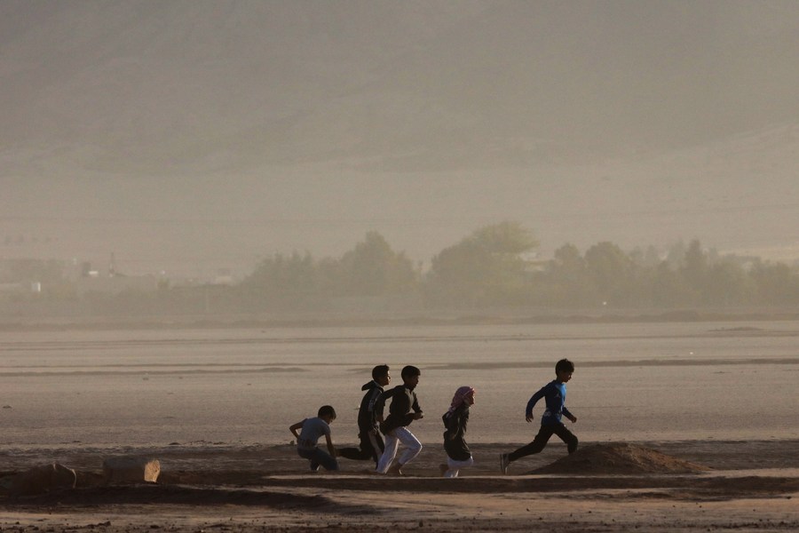 Children chase to watch a camel race in the Wadi Rum desert, south of Jordan, on Sept. 30, 2022. (Photo by Mohammad Abu Ghosh/Xinhua)