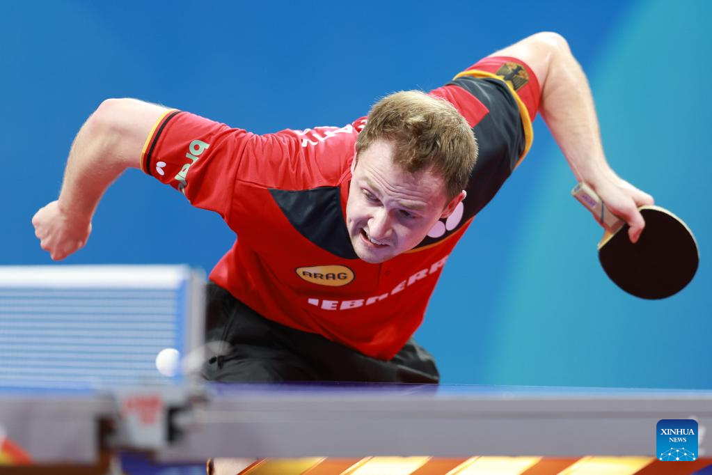 Benedikt Duda of Germany hits a return against Kirill Gerassimenko of Kazakhstan during the men's teams group 2 math between team Germany and team Kazakhstan at the 2022 ITTF World Team Table Tennis Championships Finals in Chengdu, southwest China's Sichuan Province, Sept. 30, 2022. (Xinhua/Liu Xu)