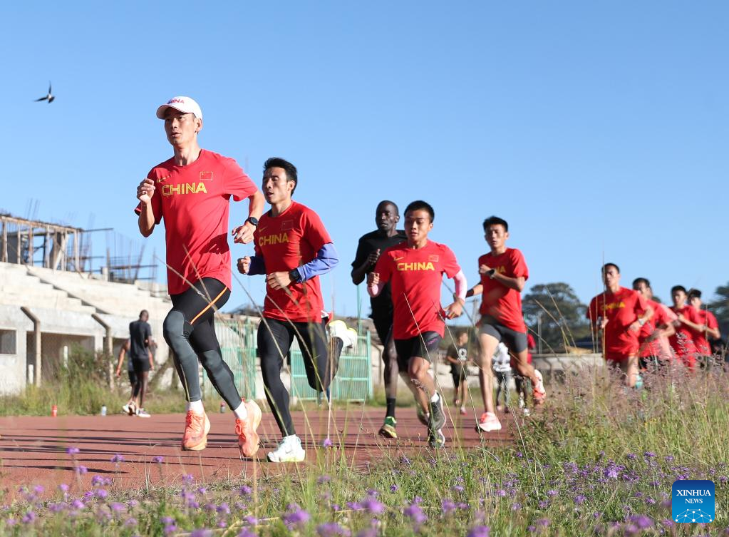 Members of the Chinese men's marathon assembled team attend a training session in Eldoret, Kenya, on Sept. 27, 2022. (Xinhua/Long Lei)