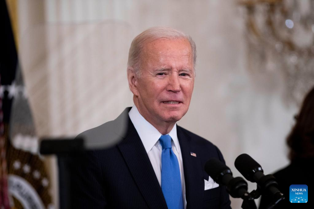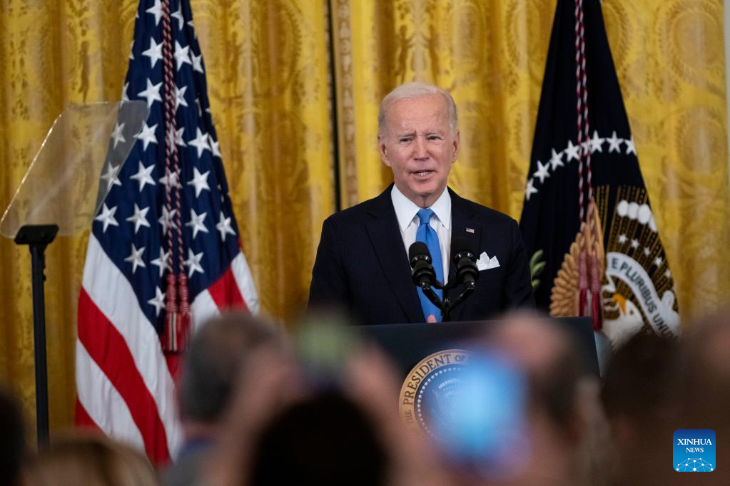 Photo taken on Sept. 30, 2022 shows U.S. President Joe Biden speaking during an event at the White House in Washington, D.C., the United States. The administration of U.S. President Joe Biden slapped new sanctions on Russia on Friday, following Moscow's formal recognition earlier in the day of four Ukrainian regions under Russian control since the early stage of the Russia-Ukraine conflict as Russian territory. (Xinhua/Liu Jie)