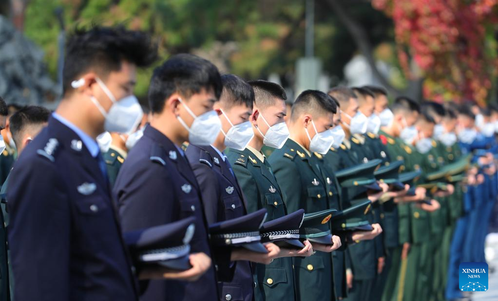 People pay a silent tribute during a commemorative event at the Chinese People's Volunteers (CPV) martyrs' cemetery in Shenyang, northeast China's Liaoning Province, Sept. 30, 2022.