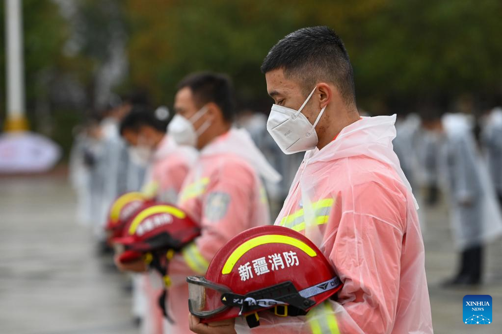People pay a silent tribute to martyrs during a commemorative event at the People's Square in Urumqi, northwest China's Xinjiang Uygur Autonomous Region, Sept. 30, 2022.
