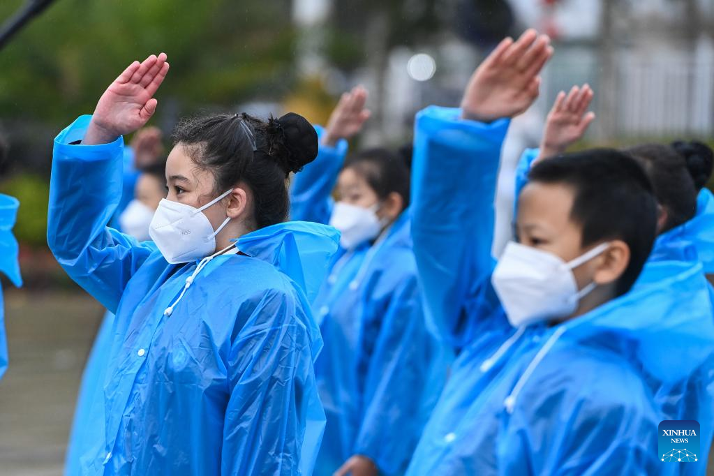 Members of the Chinese Young Pioneers (CYP), a national mass organization for Chinese children, pay a tribute during a commemorative event at Songjiang Martyrs' Cemetery in east China's Shanghai, Sept. 30, 2022.