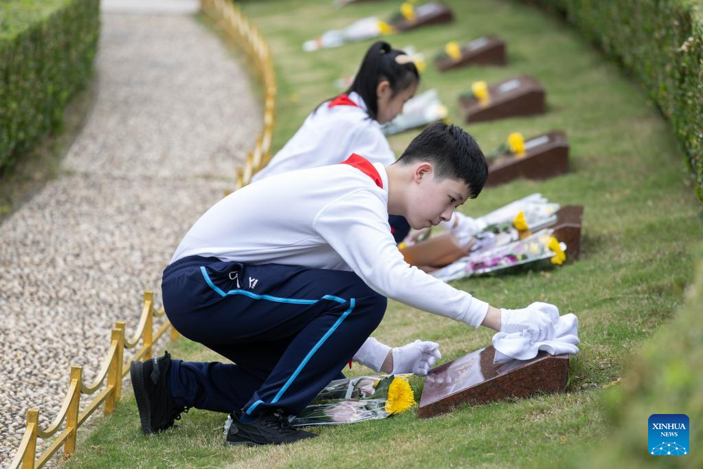 Members of the Chinese Young Pioneers (CYP), a national mass organization for Chinese children, sweep tombstones of martyrs during a commemorative event at Longhua Revolutionary Martyrs' Cemetery in east China's Shanghai, Sept. 30, 2022.