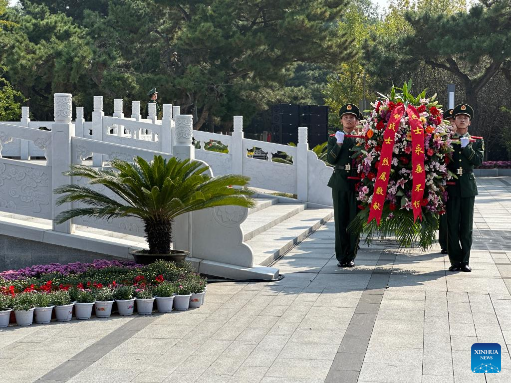 Flower baskets are presented as a tribute to martyrs during a commemorative event at the Chinese People's Volunteers (CPV) martyrs' cemetery in Shenyang, northeast China's Liaoning Province, Sept. 30, 2022.