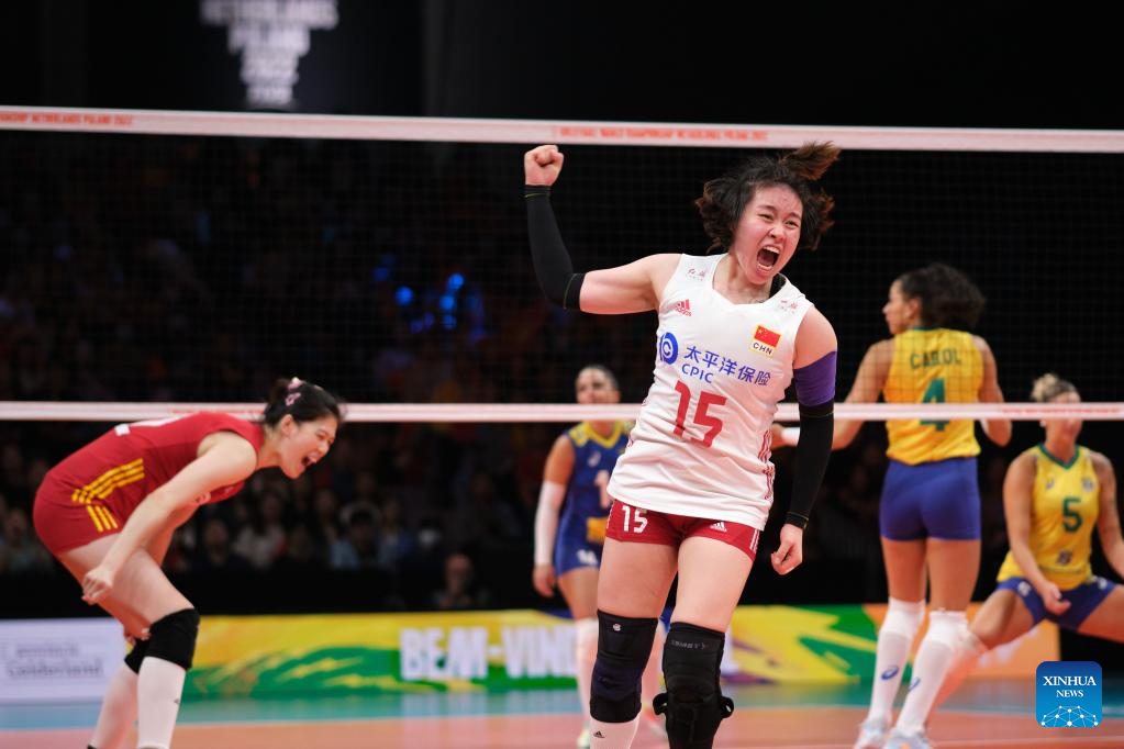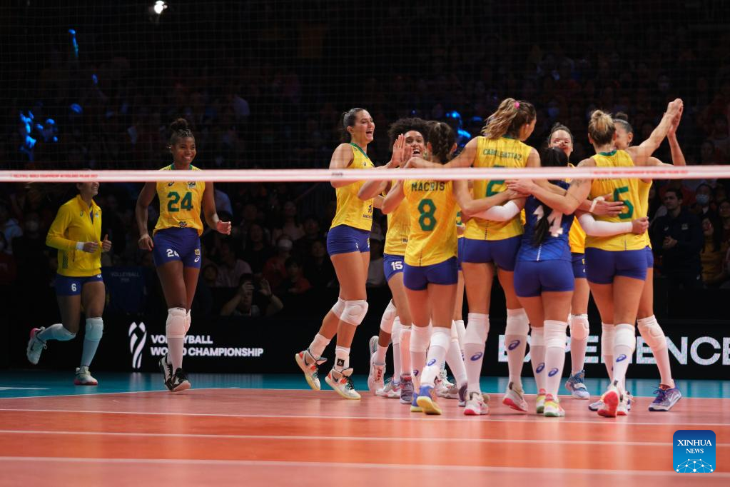 Players of Brazil celebrate victory after the Phase 1 Pool D match against China at the 2022 Volleyball Women's World Championship in Arnhem, the Netherlands, Oct. 1, 2022. (Xinhua/Meng Dingbo)