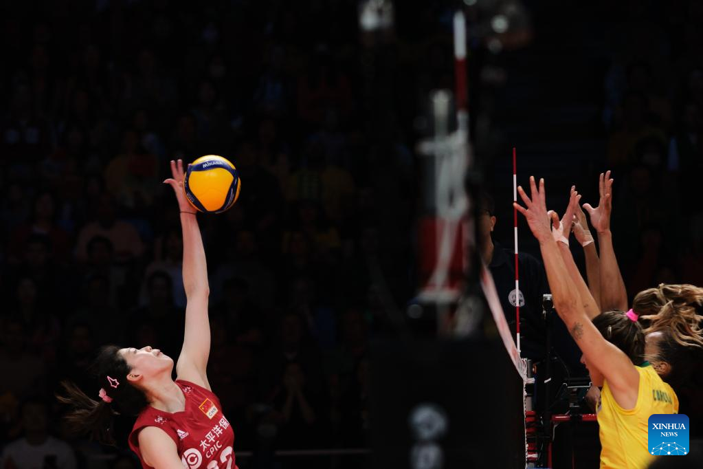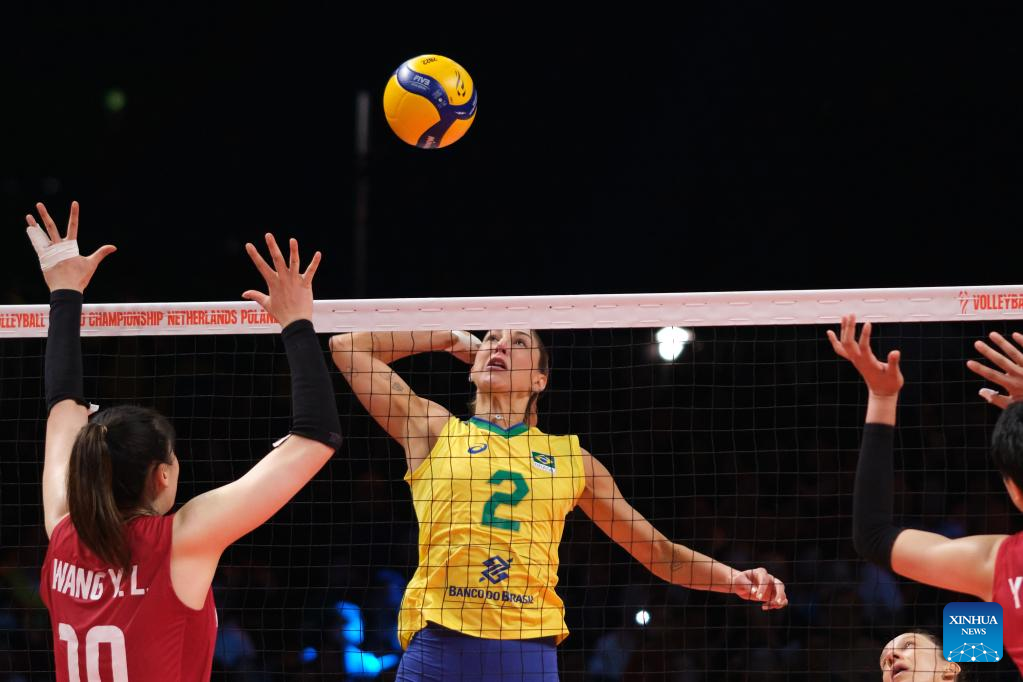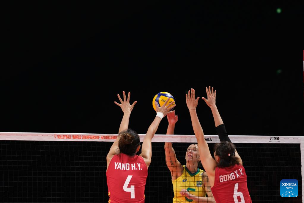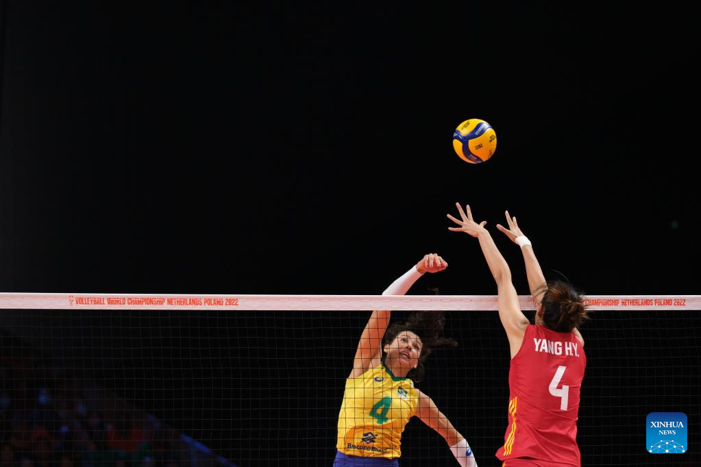 Priscila Zalewski (C) of Brazil spikes the ball during the Phase 1 Pool D match against China at the 2022 Volleyball Women's World Championship in Arnhem, the Netherlands, Oct. 1, 2022. (Xinhua/Meng Dingbo)