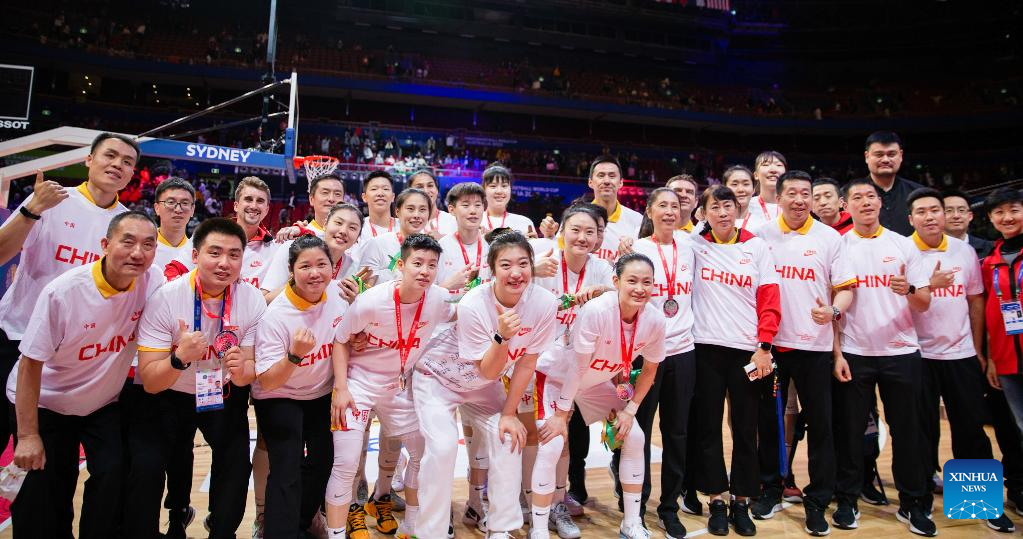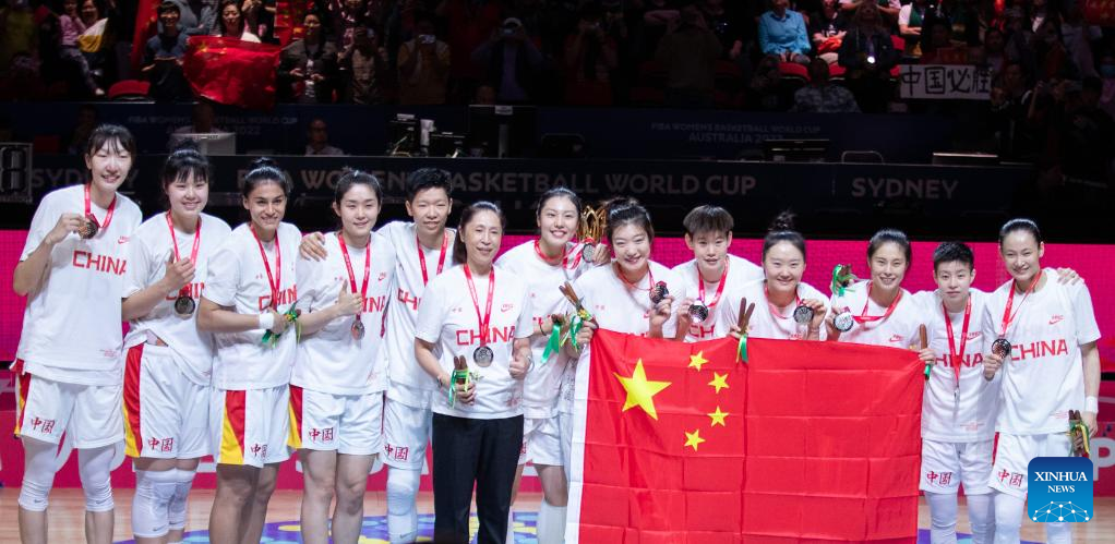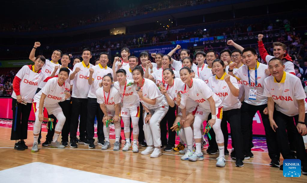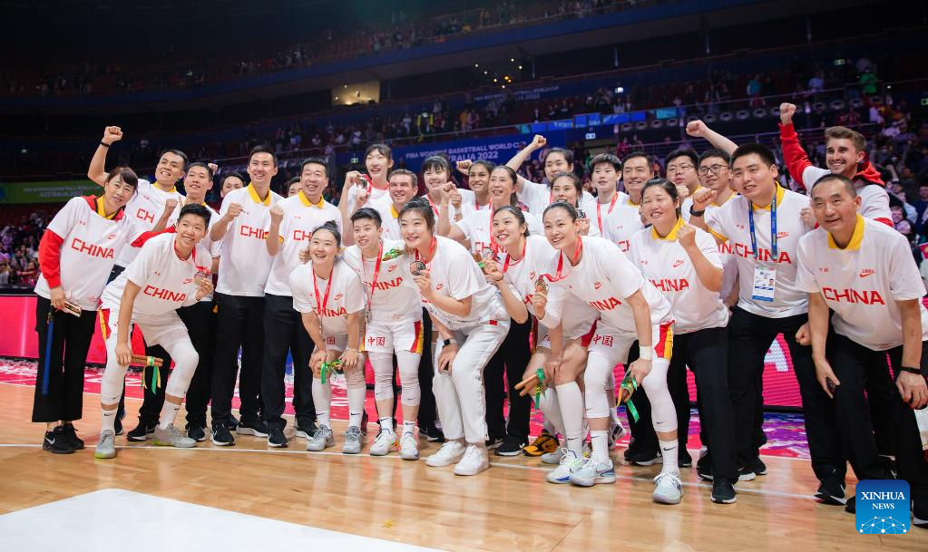 Team China members celebrate during the awarding ceremony of the FIBA Women's Basketball World Cup 2022 in Sydney, Australia, Oct. 1, 2022. (Photo by Hu Jingchen/Xinhua)
