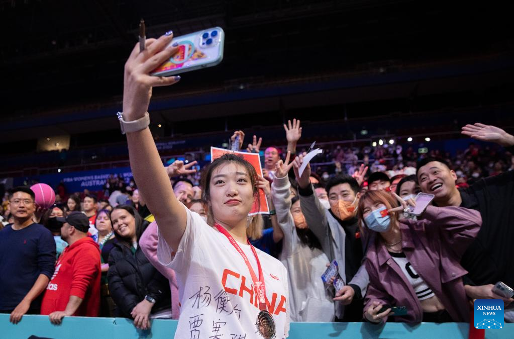 Li Meng of China takes selfies with fans after the final of the FIBA Women's Basketball World Cup 2022 in Sydney, Australia, Oct. 1, 2022. (Photo by Hu Jingchen/Xinhua)