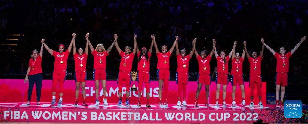 Team USA members celebrate during the awarding ceremony of the FIBA Women's Basketball World Cup 2022 in Sydney, Australia, Oct. 1, 2022. (Photo by Hu Jingchen/Xinhua)