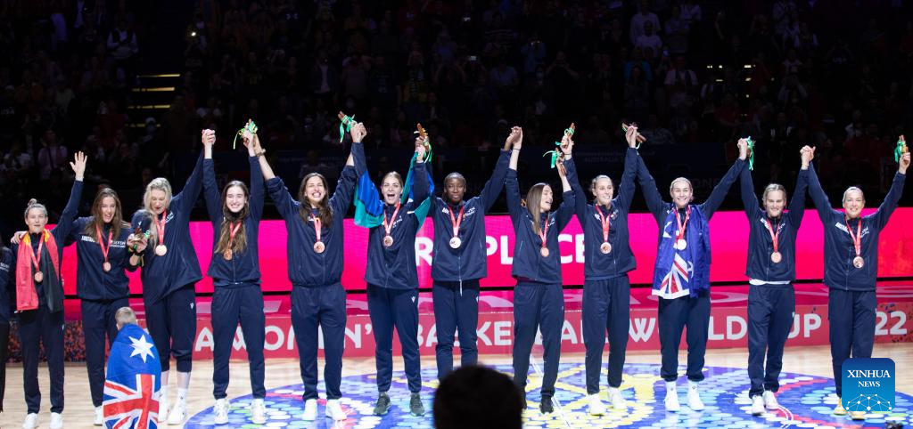 Team Australia members celebrate during the awarding ceremony of the FIBA Women's Basketball World Cup 2022 in Sydney, Australia, Oct. 1, 2022. (Photo by Hu Jingchen/Xinhua)