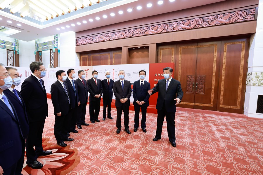 Chinese President Xi Jinping, also general secretary of the Communist Party of China (CPC) Central Committee and chairman of the Central Military Commission, views an exhibition on the C919 project's achievements at the Great Hall of the People in Beijing, capital of China, Sept. 30, 2022. Vice Premier Han Zheng, also a member of the Standing Committee of the Political Bureau of the CPC Central Committee, attended the event. (Xinhua/Li Xueren)
