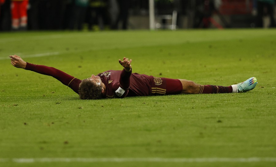Bayern Munich striker Thomas Muller celebrates his goal in the team's 4-0 victory against Bayer Leverkusen in German Bundesliga on Sept. 30, 2022. (Photo by Philippe Ruiz/Xinhua)
