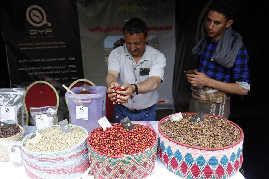 A man holds coffee beans at a booth during a coffee festival in Sanaa, Yemen, on Sept. 29, 2022. (Photo by Mohammed Mohammed/Xinhua)