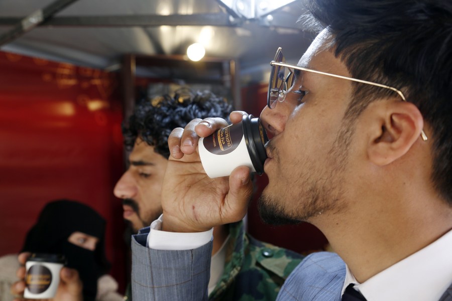 A visitor tastes coffee at a booth during a coffee festival in Sanaa, Yemen, on Sept. 29, 2022. (Photo by Mohammed Mohammed/Xinhua)