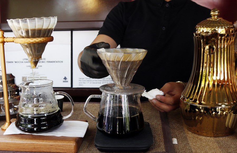 A man prepares coffee for visitors at a booth during a coffee festival in Sanaa, Yemen, on Sept. 29, 2022. (Photo by Mohammed Mohammed/Xinhua)