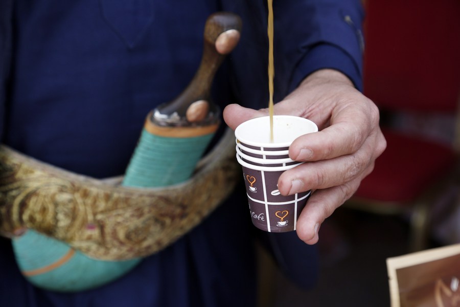A man pours coffee into a cup for visitors at a booth during a coffee festival in Sanaa, Yemen, on Sept. 29, 2022. (Photo by Mohammed Mohammed/Xinhua)