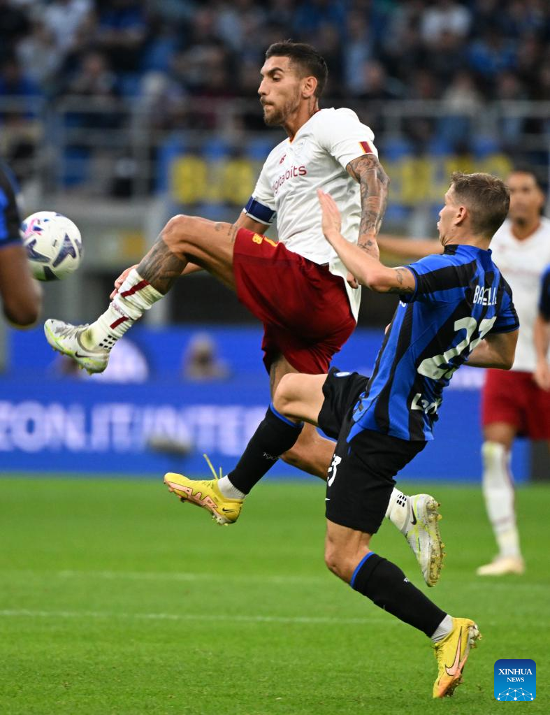 Roma's Lorenzo Pellegrini (L) vies with FC Inter's Nicolo Barella during a Serie A football match between FC Inter and Roma in Milan, Italy, on Oct. 1, 2022. (Photo by Alberto Lingria/Xinhua)