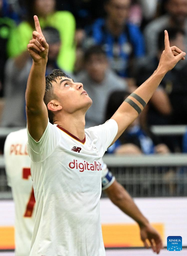 Roma's Paulo Dybala celebrates his goal during a Serie A football match between FC Inter and Roma in Milan, Italy, on Oct. 1, 2022. (Photo by Alberto Lingria/Xinhua)