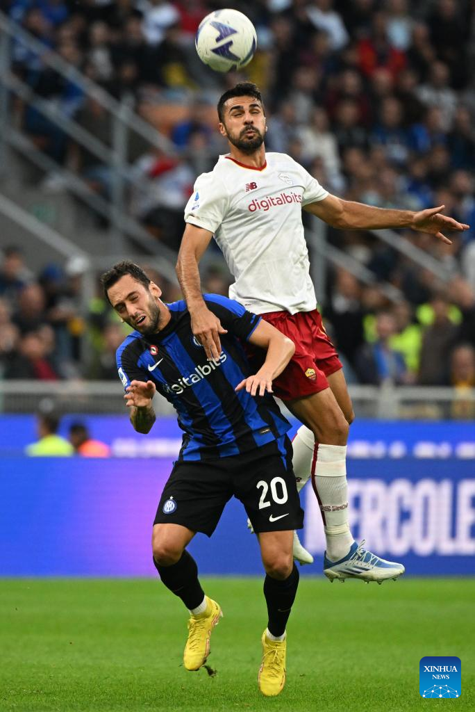 Roma's Mehmet Celik (R) vies with FC Inter's Hakan Calhanoglu during a Serie A football match between FC Inter and Roma in Milan, Italy, on Oct. 1, 2022. (Photo by Alberto Lingria/Xinhua)