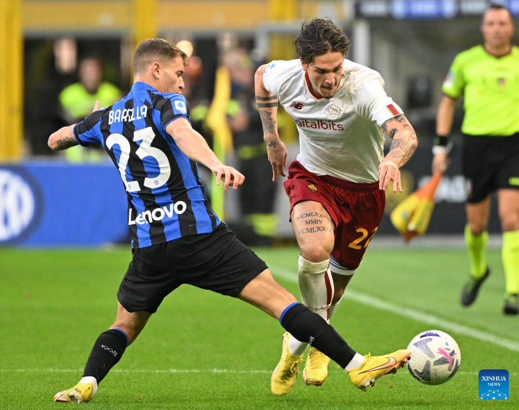 Roma's Nicolo Zaniolo (R) vies with FC Inter's Nicolo Barella during a Serie A football match between FC Inter and Roma in Milan, Italy, on Oct. 1, 2022. (Photo by Alberto Lingria/Xinhua)