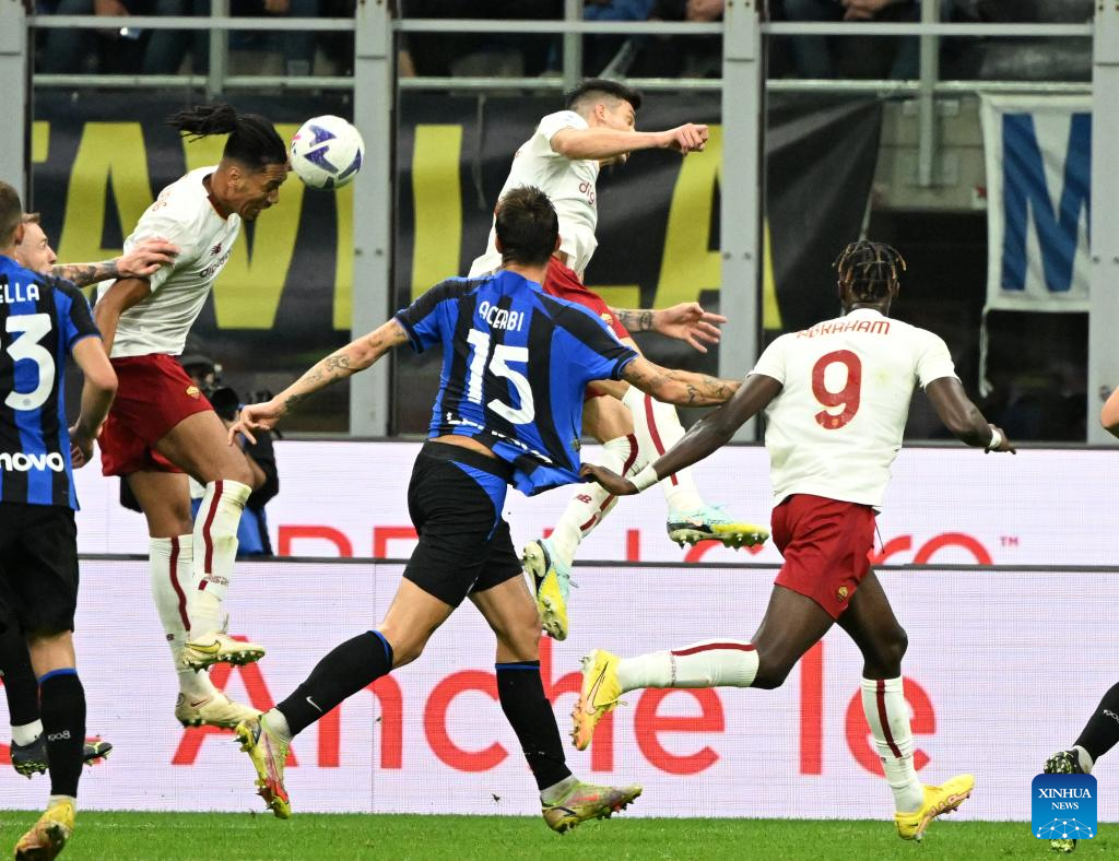 Roma's Gianluca Mancini (Top) vies with FC Inter's Lautaro Martinez during a Serie A football match between FC Inter and Roma in Milan, Italy, on Oct. 1, 2022. (Photo by Alberto Lingria/Xinhua)