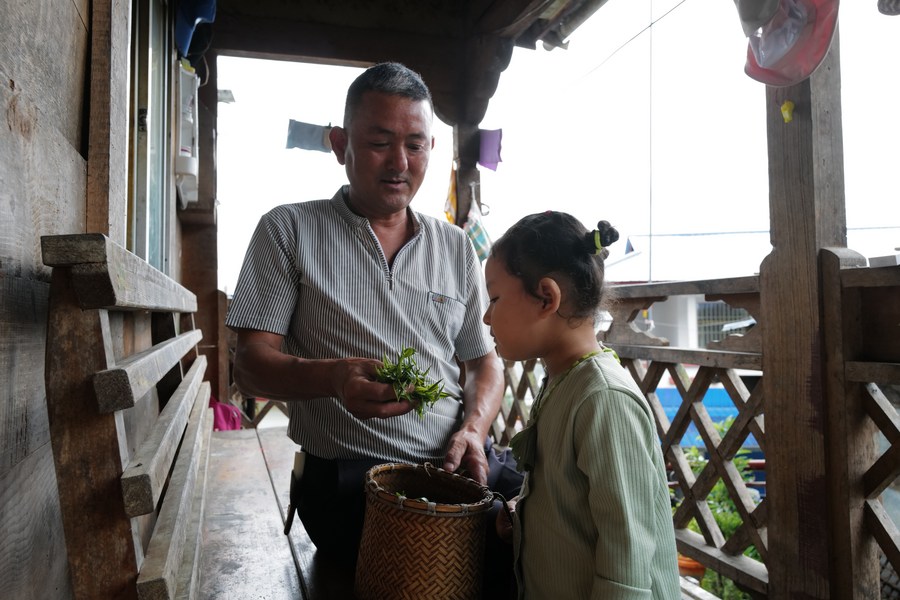 Changgar shows newly-picked tea leaves to his granddaughter in Medog County, southwest China's Tibet Autonomous Region, June 10, 2022. (Xinhua/Liu Ying)