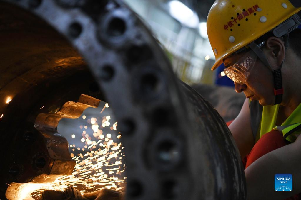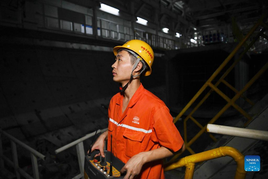 A staff member works at the construction site of a tunnel across the Yangtze River in Wuhu, east China's Anhui Province, Oct. 3, 2022. (Xinhua/Zhang Duan)