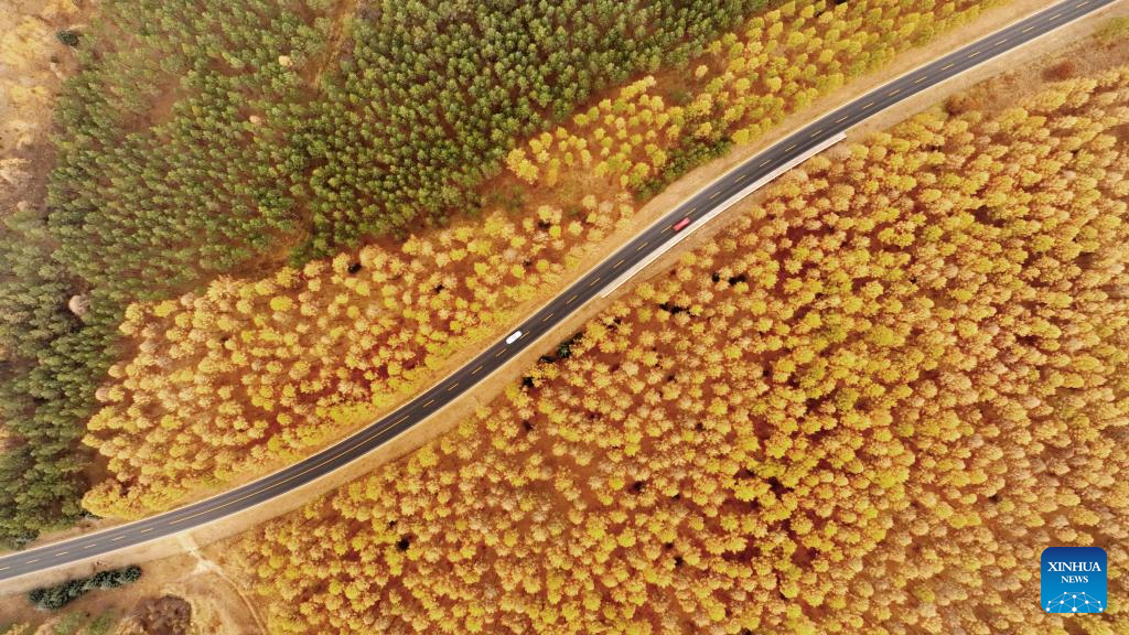 Aerial photo taken on Oct. 2, 2022 shows the scenery at Saihanba National Forest Park in Chengde City, north China's Hebei Province. (Photo by Wang Long/Xinhua)