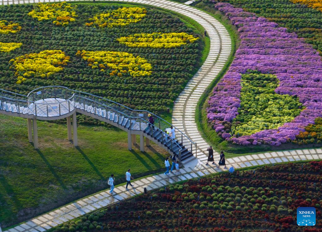 Aerial photo taken on Oct. 3, 2022 shows tourists enjoying themselves at a scenic spot in Huai'an, east China's Jiangsu Province. (Photo by He Jinghua/Xinhua)