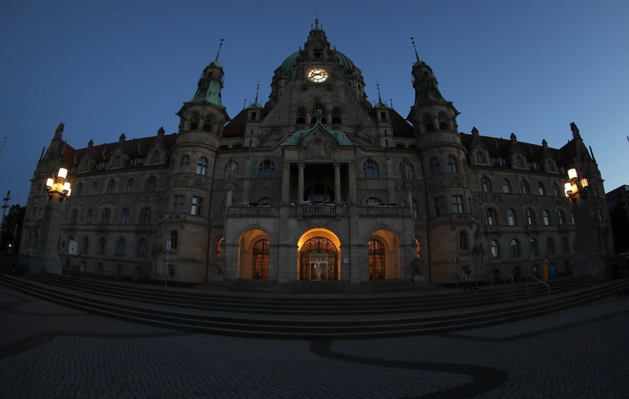 Photo taken on Aug. 1, 2022 shows a night view of the city hall in Hanover, Germany. Some landmark structures across the country have reduced their night illumination to save electricity. (Photo by Joachim Sielski/Xinhua)■