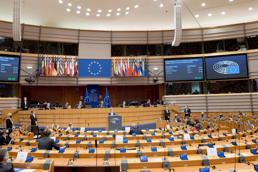 European Commission President Ursula von der Leyen (C) delivers a speech during a plenary session of the European Parliament in Brussels, Belgium, on Jan. 20, 2021. (European Union/Handout via Xinhua)