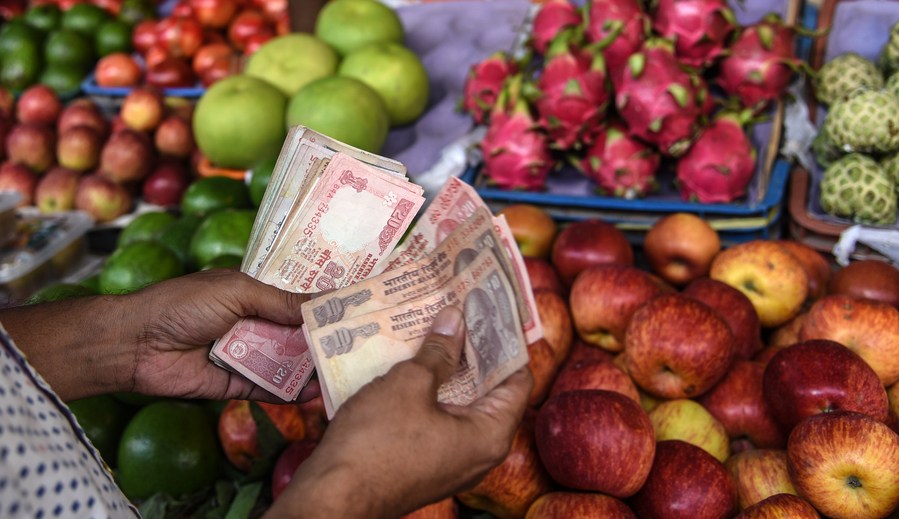 A vendor counts Indian currency notes at a vegetable market in Mumbai, India, Aug. 30, 2018. (Xinhua/Stringer)